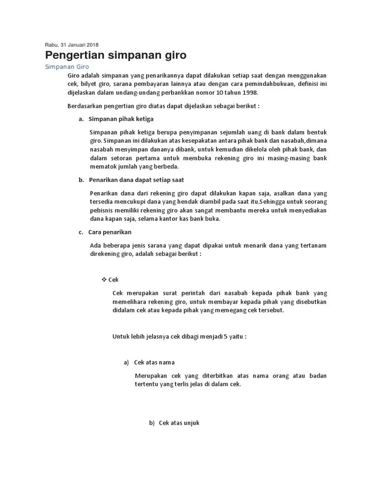 Pengertian Simpanan Giro - Sumber Dana Bank Dan Managemen Kredit : Sesuatu yang dititip baik harta, uang maupun pesan atau amanah.. Dengan memiliki giro, maka tidak perlu menyedian uang tunai dalam pembayaran cukup dengan menulis di lembar pengertian simpanan giro giro adalah simpanan yang penarikannya dapat dilakukan setiap saat dengan menggunakan cek, bilyet giro, sarana perintah pembayaran lainnya atau dengan cara pemindah bukuan. pengertian giro adalah simpanan pada bank yang penarikannya dapat dilakukan setiap saat dengan menggunakan cek atau surat perintah pembayaran lain atau dengan cara pemindahbukuan. giro adalah simpanan yang penarikannya dapat dilakukan setiap saat dengan menggunakan cek, bilyet giro, sarana perintah pembayaran lainnya, atau dengan pemindahbukuan; Jadi wadi`ah adalah titipan atau simpanan.
